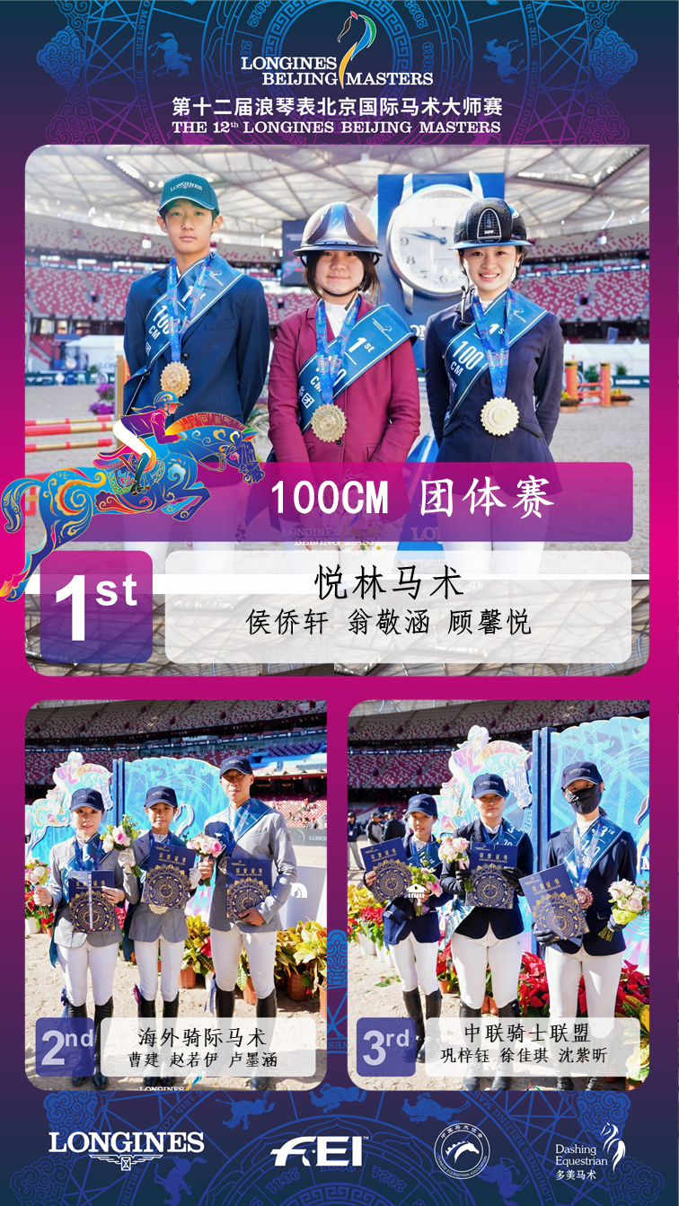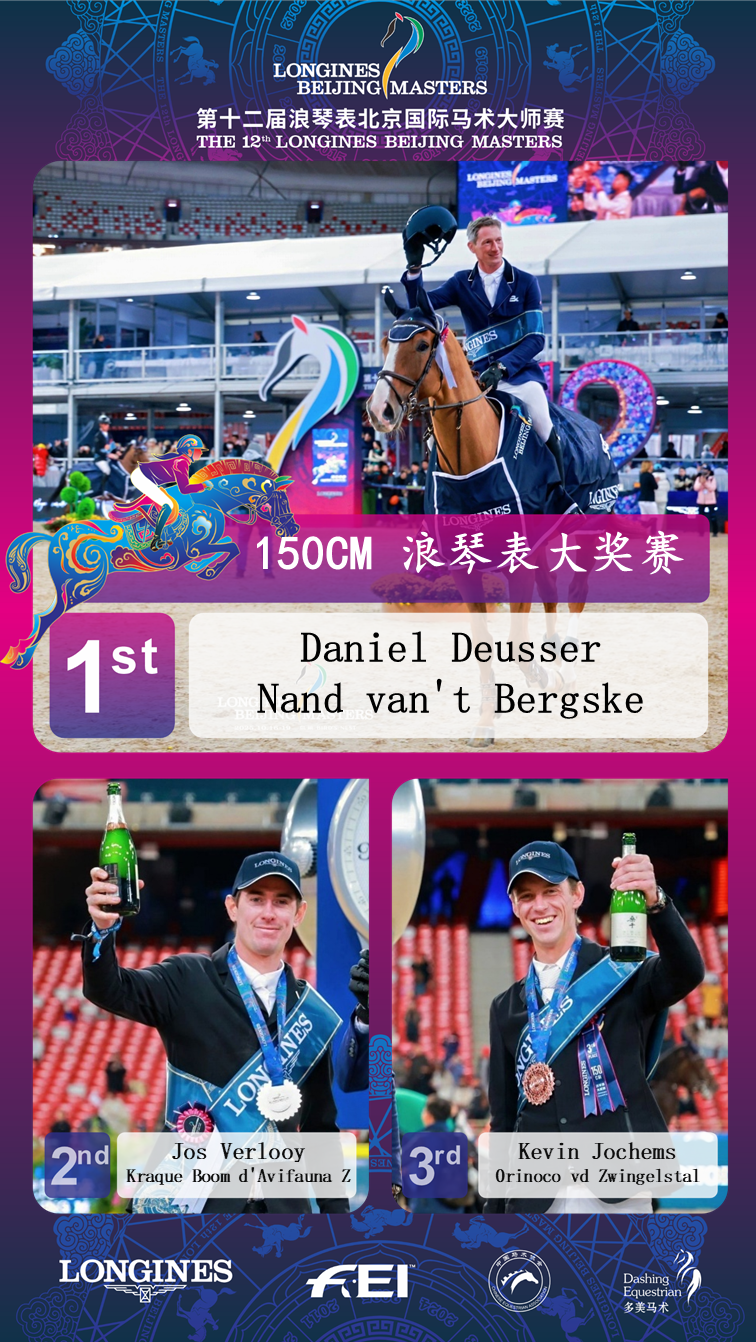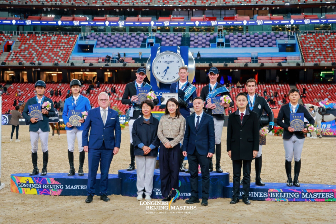[2025年10月19日]第十二届浪琴表北京国际马术大师赛圆满完成收官日的争夺战!从100CM团体赛的默契协作,到105CM公开赛的精准争时;从135CM EuroHorse精英赛决赛的激烈角逐,到150CM浪琴表大奖赛的压轴对决,赛场上每一次呼吸都交织着信任的共振,每一个跨越都标记着信念的刻度。 上午8:00的100CM团体赛中,悦林马术凭借三位骑手的出色发挥成功登顶!骑手侯侨轩策骑擎天柱、翁敬涵搭档念月、顾馨悦与吉尔协同发力,以4罚分、176.29秒的成绩夺冠。海外骑际马术以4罚分、179.85秒获得亚军,中联骑士联盟以4罚分、194.85秒摘得季军!每支战队的人马同心,都是赛场最动人的风景。 上午12:45,105CM公开赛圆满完赛!骑手张羽翔策骑“辰美丽”凭借精彩表现以零罚分、48.60秒的出色表现夺得冠军!安佳琪策骑“恩九拉”以零罚分、49.24秒的成绩获得本场比赛亚军;沈紫昕策骑“小灰灰”以零罚分、50.22秒收获季军。 下午13:50开赛的EuroHorse精英赛135CM中,澳大利亚骑手Christella Tang与策骑Golden Boy V以零罚分、48.20秒的惊艳表现斩获冠军,人马配合如行云流水,每一次跃起都是力与美的极致展现。蔡晟杰与“扬帆”以4罚分、45.64秒收获亚军,曾亦纯搭档“雅典娜”以4罚分、50.23秒的成绩位列季军。 下午16:40,压轴的150CM浪琴表大奖赛更将赛事推向巅峰,争夺激烈!11对人马组合成功晋级附加赛,不仅展现了马术运动的独特魅力,更让现场及屏幕前的观众全程热血沸腾!德国骑手丹尼尔·杜瑟(Daniel Deusser) 策骑“Nand van't Bergske”历经一轮争时赛与附加赛的极致考验,最终以0罚分、46.39秒的完美表现力压群雄,加冕冠军!这场终极较量不仅是对技术的淬炼,更是对心态的顶级考验,丹尼尔·杜瑟的胜利完美诠释了人马合一的巅峰境界。乔斯·维罗伊(Jos Verlooy)与战驹Kraque Boom d'Avifauna Z以0罚分、47.59秒的出色成绩斩获亚军;凯文·乔赫姆斯与(Orinoco vd Zwingelstal) 以0罚分、47.82秒收获季军。 当最后一道腾跃划过赛场,2025第十二届浪琴表北京国际马术大师赛正式落下帷幕!这场汇聚顶尖骑手的马术竞技盛宴,以速度与优雅的极致碰撞、人马同心的默契,为所有观众留下了诸多直击人心的震撼瞬间。 图|150CM 浪琴表大奖赛颁奖典礼 图|150CM 浪琴表大奖赛冠亚季军庆祝仪式 让我们共同期待明年十月再度相聚鸟巢,共同见证新传奇的诞生,续写马术运动的璀璨篇章 |