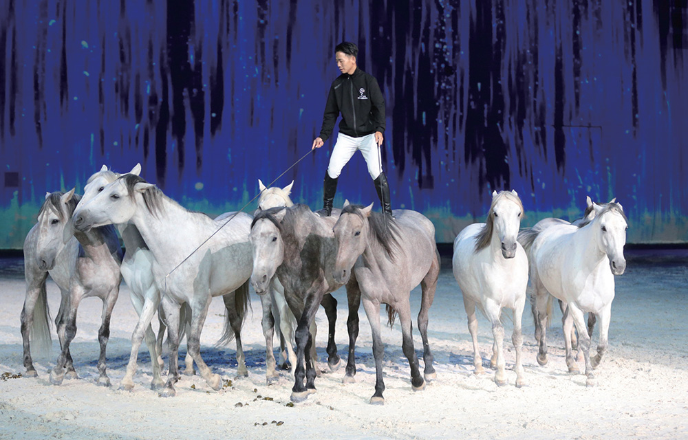 本届马术节开幕式上有一个表演节目让人眼前一亮。帷幕拉开,九匹白马并行,一人立于中间的两匹马上,缓缓进场。待到达场地中间,九匹马并排面向观众站定,人行于马背之上,轻身一跃而下。在他的指引下一匹匹马温顺地跪下,卧倒。不是没有见过这样的表演,只是以往所见的表演者都是欧美面孔,我们国内当下就有能够完成如此自然和谐的人马表演的人,况且他还是一个无师自通的年轻人,让人仿佛看到了一束光,原来在我们的土地上也有通往马术的路。