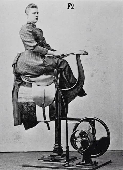 维多利亚时期一位正在练习骑术的女士,即使是在训练器械上,她也使用侧骑