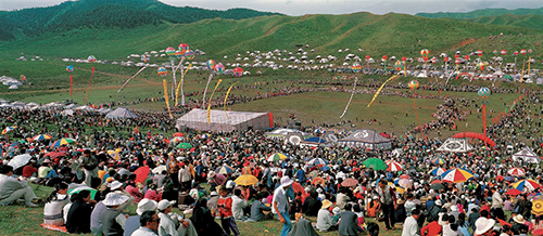 西藏,是一个具有神圣感的地方。处在高原清净之地,人的心也异常干净,像是受到了洗礼一般。初来乍到的旅人该怎样才能更快地走进、了解这里淳朴而高贵的藏民的生活当中呢?或许参加一场赛马会是最好的选择。 爱马是牧民的天性,在藏民眼里“马虽然长着畜牲的毛皮,却具有神的灵气和感情”。赛马不仅是农牧民闲暇之余的集会、交流农牧业生产经验的场所,也是藏民族精神的展示。按藏族传统,在喜庆的节日、集会上都要举行赛马,以助雅兴。在赛马会上有马术、马技等比赛,还有精彩的文艺汇演、民歌大赛、民族服饰展演。 在藏族地区,有些地方的赛马活动最初是检阅骑兵队伍的一种形式,源于藏族英雄格萨尔每次出征前要举行跑马射箭的习俗。生于西藏高原的格萨尔,抵御过外来的入侵,捍卫了本土,并开疆拓土,创建岭国,战功卓著,为民族的统一作出了巨大贡献。因此,在藏民族的英雄崇拜信仰中,力量、勇敢、智慧成为向往、崇拜的对象,成为衡量男人价值的标志。 赛马首先要给骏马精心打扮、除给马备上精美的鞍鞘、笼头外,还要给马额插彩花,脖披彩绸,尾巴边扎梳成辫形。 有些地方则骑着光背马参赛,以增加比赛的难度。参赛的骑手也要精心打扮,穿上华美的彩衣或紧身服,戴上红缨帽、大头帽或金花帽,背起叉子枪,显得格外俊俏潇洒。 赛马的形式种类不一,以距离来说,一般从十里到几十里,也有十里以下的中程赛或一二里的短程赛;以马来说,有骏马赛、马驹赛、母马赛;以骑手来说,有成人赛、孩子赛、姑娘赛等;也有无骑手的骏马赛,以先到达终点者为胜,有时也评判骏马的身架走法,有的还比赛骏马和骑手的衣饰。此外,还有表现高超骑术和技巧性的马上运动如马上拾哈达、马上敬青稞酒、马上斩劈或拨旗杆,马上形体表演、马上射击、射箭等项目,有时还包括有类似于盛装舞步的走马赛。 赛马会可谓物资交流会,扶老携幼的牧民们在搭起的密密麻麻的帐篷里,出售自己生产和采撷的肉类、酥油、湖盐、虫草、贝母等产品,并且买进整整一年需要的生产生活用品。赛马会同时也是牧民财富的展示会,牧民们大都用出售产品的收入制作华丽的帐篷,购买服饰打扮妻女;在帐篷上绘制金鱼、海螺、胜利幢、福瓶、莲花、吉祥结、法轮、伞盖吉祥八宝,并且高插五色经幡。人们通过赛马会娱乐身心,欢庆丰收,显示年轻人的勇敢与剽悍,同时祭祀大地神和雪山神。 藏族的赛马节有很多,如藏北那曲赛马节、江孜达玛节、康定赛马节、盘坡赛马节、天祝赛马节、当雄赛马节和定日赛马节。在西藏民间,沿袭至今的达玛节、望果节、萨嘎达瓦节等信仰祭祀活动,赛马也是其中不可缺少的内容。其中以当雄和那曲两地最为热闹,历史也最为悠久。 一年一度的那曲羌塘恰青赛马艺术节,就是这个游牧民族最大型的节日之一了。在这里,每年七八月份,羌塘草原牧草茂盛,一片碧绿,到处盛开着一束束、一簇簇姹紫嫣红、灿若云霞的各种各样的野花,宛若一副尽善尽美的天然画卷。艺术节上,那曲各县乡的牧民们身穿艳丽的民族服装,佩戴着各式玲珑精致、独具藏北特色的头饰、胸饰、腰饰,于花海似的草原中一路踏歌而来;赛马场四周,支起了五颜六色的帐篷,将芳草荫荫的草原点缀得五彩缤纷,直至连成一片蔚为壮观的“城市”。物资交流,文艺汇演,各种民间体育如拔河、跳远、抱石头等以及与宗教有关的活动的举行令这“城市”实有其名。 早在赛马会之前好几个月,参赛的马便不再使用而投入训练。起初每隔 7 天练跑一次,练跑后用凉水洗澡,以增强其抗寒能力。临近比赛时每天练跑两次,再沐浴一次。沐浴后用羊毛毡包裹全身保暖,同时喂精心调制的冰糖山羊奶,照顾得比婴儿还要精心。草原赛马分长跑、短跑、跑马射击、马技等项目,长跑又有大跑、小跑、走步 3 种。长跑距离大约 310 公里,驭马者多为十来岁的少年,因身轻不影响马的速度。马都是光背,最多铺一张薄毯。 正式比赛之时,虔诚的骑手们都要先绕着巨大的焚香台转圈以示敬意,接受德高望众的喇嘛的祝福。这可以看作是英姿勃发的骑手和披红挂彩装扮一新的参赛马匹的亮相。枪声响处,几十匹或者上百匹藏北马风驰电掣般地冲向终点,两边有成千上万身穿节日盛装的牧人为骑手呐喊鼓劲。这是粗犷豪放的牧民们与天地最为热烈的情感交流。 赛马冠军往往能得到一匹马或者相当一匹马的钱,当然他获得更多的是荣耀,人们所献的吉祥哈达会将他和他的赛马淹没。同部落或者牧场的人还会把他抬起来,牵着优胜的马在节日的人海里欢呼着游行。他和他的马将很快名传藏北,无论走到什么地方都受到贵宾似的款待。最后一名也会得“奖”,人们在他的脖子上挂串马粪,讥之为“拾马粪的”。 马术表演者多为技艺娴熟的成年骑手,他们俯倾在马鞍上,一边任马奔驰,一边捞取摆在地上的哈达、钱币。另有点烟的,前一位把火绒草打着扔在地上,后一位嘴衔一尺长的烟管,猛然俯身捞起火绒点燃烟管,然后洋洋自得地环顾左右抽起烟来。还有跑马射击,场地一侧栽一溜靶子,骑手执枪催马,从另一侧驰进靶区。他们用右手在头顶转枪,又从身后换左手接枪继续旋转,接着大吼一声“格 - 嘿 - 嘿!”瞄准靶子放上一枪。又朝第二个靶子射一箭;在第三个靶子上刺一刀。“格 - 嘿 -嘿!”之声和枪声、蹄声轰鸣一