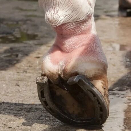 背部/臀部出现带黄绿色脓痂的竖立毛发;或蹄冠、球节处皮肤增厚结痂,甚至引发跛行。多因马匹久处泥泞环境,嗜皮菌在潮湿缺氧的皮肤上大量繁殖所致。