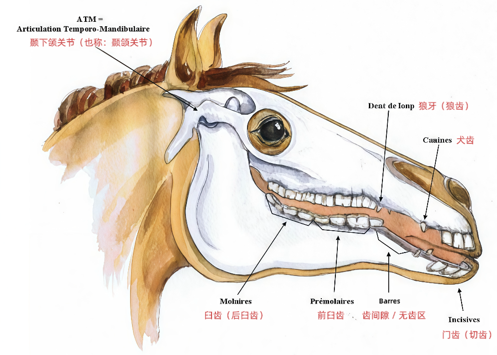 从功能解剖角度来看,马的嘴部并不是一个孤立结构。衔铁的压力会通过:唇部与口角、颞下颌关节、舌骨系统、深层颈部肌群,向后影响颈部张力,进而影响背部与整体运动质量。