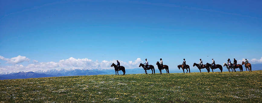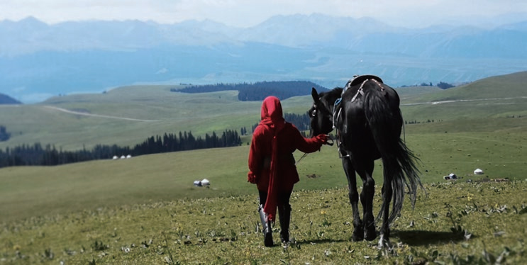 我们没心没肺地在草原上飙马撒欢的时候,牧仁常常一个人走得远远的,望着远方出神。这些天我最常看到的,是他在雪山前地平线上的背影。