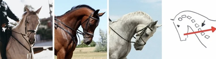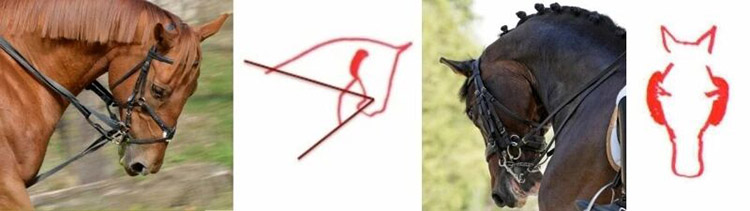 这意味着马的鼻线不再接近垂直,而是明显向胸口方向收回,枕部失去最高点,颈部出现过度弯曲。从外观看,它可能依然安静、柔软甚至“漂亮”,但本质上,它已经不再真正通过身体向前传递能量,而是在用缩颈的方式回避接触。这种状态通常发生在马开始变得沉重之后,骑手为了控制它而不断增加手的压力,最终形成一种微妙的对抗关系。马并没有真正接受衔铁,而是选择退出连接。
