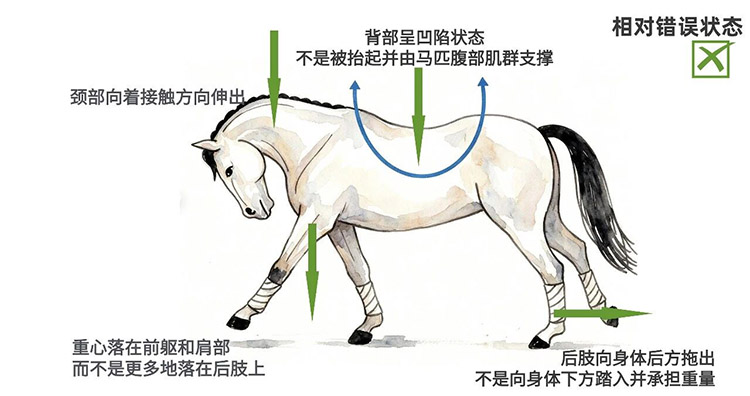 一旦用内侧缰“拉低头”,马往往会进一步缩颈,问题反而加重。