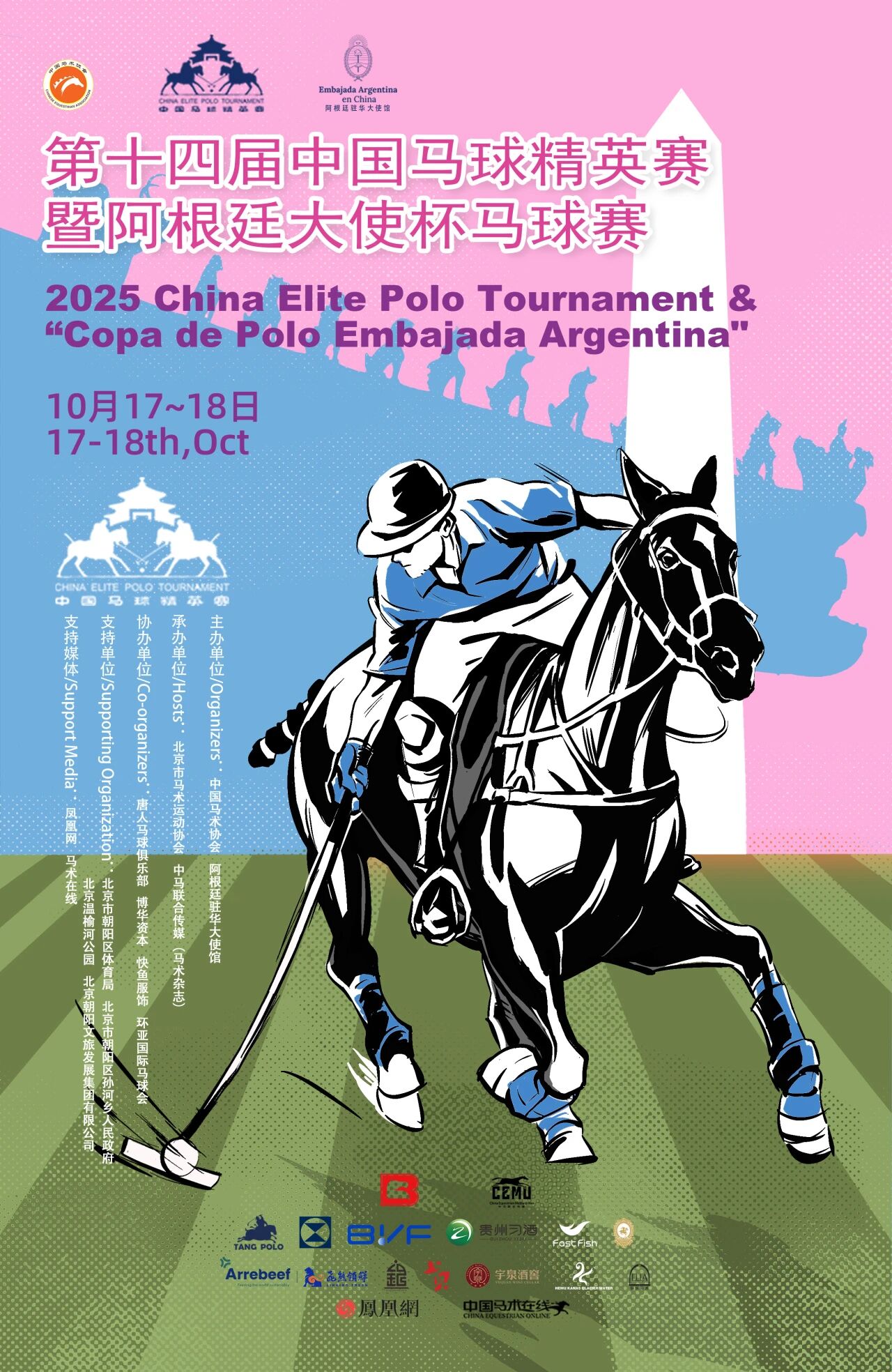 2025年10月17日至18日,第十四届中国马球精英赛暨阿根廷大使杯马球赛将于北京市朝阳区温榆河公园 · 北京市马术运动协会马球赛事中心盛大举行。 届时,绿茵草场上,骏马奔腾、球槌挥舞,一场融合竞技与文化的秋日马球盛宴即将启幕。 精英荟萃,共襄盛举 本届赛事由中国马术协会与阿根廷驻华大使馆联合主办,北京市马术运动协会与中马联合传媒(《马术》杂志)承办,唐人马球俱乐部、博华资本、快鱼服饰、环亚国际马球会协办,获得了北京市朝阳区体育局、北京市朝阳区孙河乡人民政府、北京温榆河公园及北京朝阳文旅发展集团有限公司的大力支持。赛事媒体合作伙伴为凤凰网与马术在线。 作为中国高水平马球赛事之一,中国马球精英赛自2008年创办以来已成功举办十三届,成为国内马球界认可的年度经典赛事。 2025年第十四届赛事将在延续传统的基础上,以更国际化的姿态、更高规格的标准,为观众呈现速度与优雅并存的马球盛宴。 以马为媒,传递友谊 马球不仅是一项体育竞技,更是一种沟通文化的语言。 中国的马球文化可追溯至千年之前的汉唐时代,历史悠久、底蕴深厚;阿根廷的马球竞技水平在世界马球领域占据着领先地位,拥有无与伦比的传统与技艺。 第十四届中国马球精英赛暨阿根廷大使杯马球赛,承载着促进中阿两国文化交流与友谊的使命。来自中国与阿根廷两国的马球手将组队同场竞技,在绿茵草场上“以球会友、以马传情”,展现这项运动的独特魅力与精神内核。 文化与竞技的交汇点 第十四届中国马球精英赛暨阿根廷大使杯马球赛,以马为桥梁,以马球为纽带,让世界看到中国马球的蓬勃生机与文化自信。