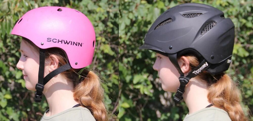 这意味着马术头盔必须应对多方向、高冲击、甚至旋转加速度的撞击风险。 因此,头盔的防护重点是吸收坠落冲击、减轻脑震荡风险。 观察可发现,相对于自行车头盔(左),马术头盔(右)在头部的前方、侧方和后方覆盖面积都更大 ©Tracy Dopko 它们在设计上使用了不同的材料组合,专业标准也完全不同: 在进行测试时,自行车头盔的测试线区域(即头盔受到冲击的区域)比马术头盔的位置高得多。 因此,自行车头盔的覆盖范围较小,对头盔下部的保护也较弱。 马术头盔还要经过穿透测试,包括用3公斤重的尖头物体从0.75米高处垂直落下进行60度角冲击测试,以及侧向挤压测试。 自行车头盔则无需进行这些额外的测试。 舒适同样重要 自行车头盔不合适,摩托车头盔自然也不适用于骑马。 骑马不像赛车,一场训练动辄一小时以上,而且多数在阳光下进行。