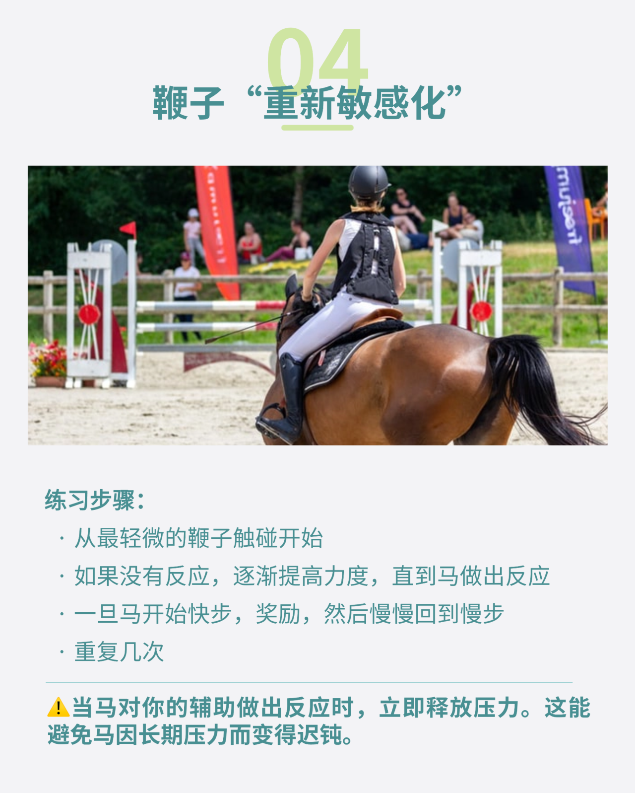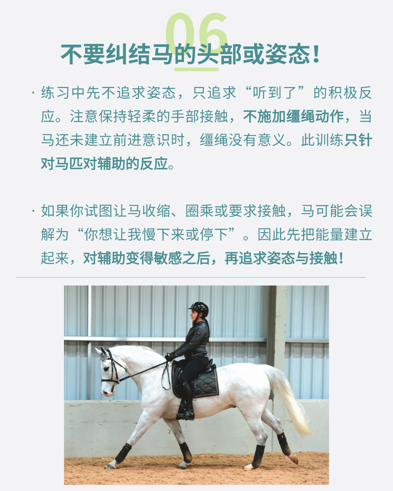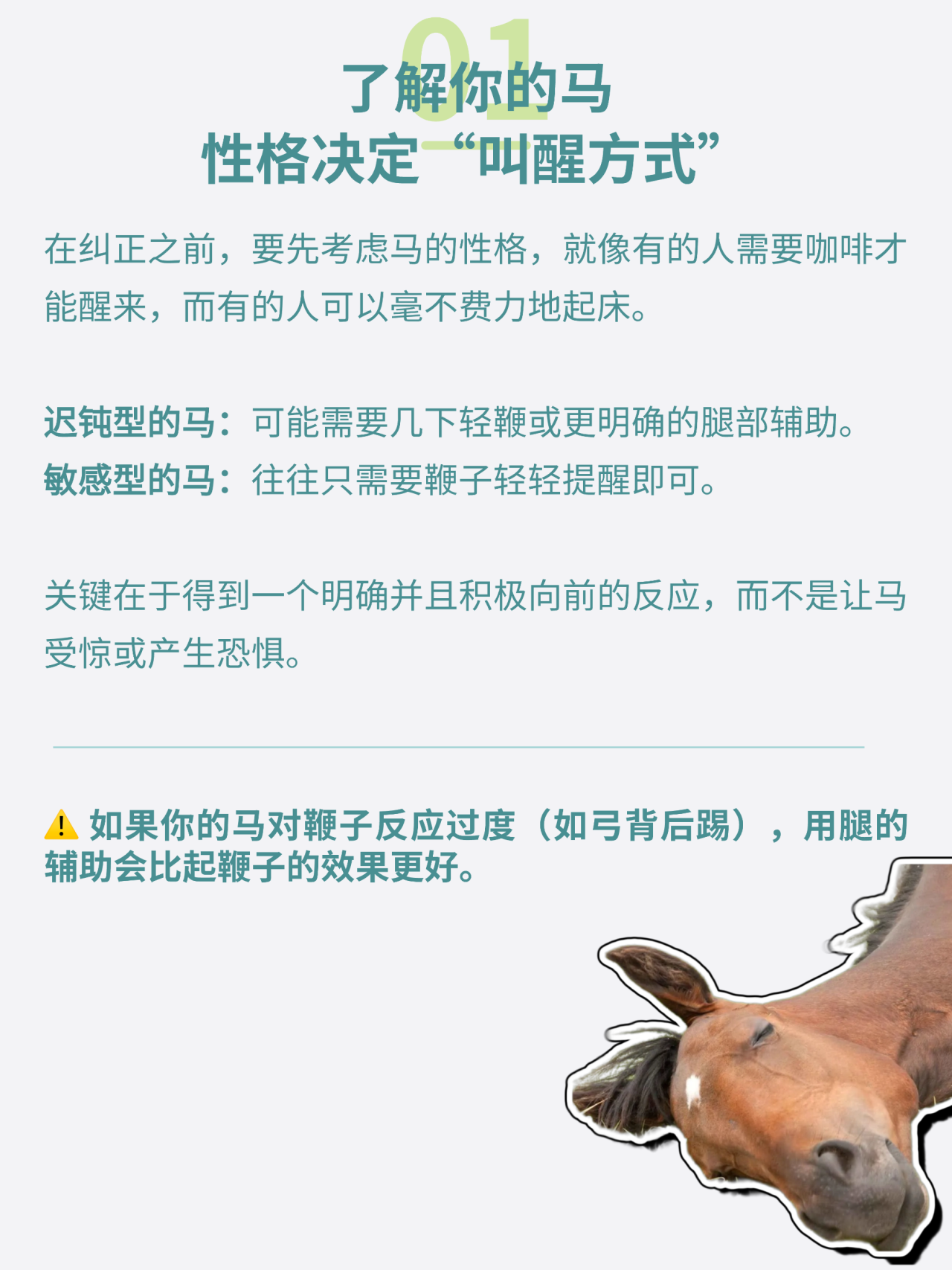 你是否常觉得自己拼命想让马“向前”,而你的马却步伐慢吞吞、反应懒洋洋?事实上,马天生并不懒,它们非常敏感,就连苍蝇落在身上都能感受到。所以对骑手的辅助(Aid)迟钝并非天性,而是训练中逐渐形成的习惯。通过正确的方法,你完全可以重新唤醒马对辅助的敏感性。 唤醒马,也是在唤醒骑手的训练思维。通过让辅助更清晰、奖励更及时,你不仅能让马重新敏感、有动力,也能让整个骑乘过程变得轻松愉快。训练目标不是“让马变快”,而是 让马愿意回应你。 |