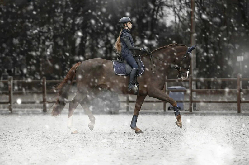 想象一下一个寒冷的清晨,你刚走出家门,身体还没“醒”,却被要求立刻冲刺跑步。即便是职业运动员,也很难在这种情况下发挥,甚至可能受伤。马匹也是一样,如果在身体未准备好的情况下就进入高强度训练,不仅效率低,还会增加受伤和疲劳的风险。 因此,冬季训练需要更有结构、更有耐心的热身与放松流程,让马在寒冷中依然能稳定、舒适地工作。 1.寒冷对马的影响 寒冷会令马的肌肉弹性下降、关节活动受限,反应变慢。充分的热身可以逐步提高肌温、扩展关节活动范围、提升肌肉供氧效率,从而降低拉伤和损伤风险,并改善步态与节奏稳定性。反之,缺乏热身或草率热身会导致马匹乳酸堆积,训练后出现僵硬、酸痛甚至更严重的损伤。 2.上马前记得先... 检查和准备场地: 如果不希望在冬季被坚硬、坑洼的地面所困,真正的准备其实应当发生在霜冻之前。提前完成场地整平,能让地面在低温中更均匀地冻结,对马匹腿部来说也更安全。 结冻是冬季骑乘的常态,真正危险的,往往不是天气本身,而是被忽视的场地细节,糟糕的地面条件几乎等同于一次尚未发生的意外。因此,每次骑乘前提前检查场地状况,若条件不理想,应优先选择室内场地。 骑手也需要热身: 马匹对骑手的情绪与身体状态极为敏感。如果你在寒冷中感到僵硬、紧张,这种状态会直接传递给马。在上马前进行简单的身体热身,能够有效改善你的骑乘坐姿、柔韧性和整体协调性。全身性的拉伸、肌肉激活练习,例如自重深蹲、开合跳、平板支撑等动作都能帮助你迅速激活核心、唤醒因寒冷而僵硬的身体。 3.分阶段热身 充分的热身可以增加马匹关节活动范围、提升肌肉弹性、预防拉伤并且改善步幅质量,使马在场地中更平衡、节奏更稳定。 热身可以从10~20分钟的松缰慢步开始,期间可以多次变换方向与路线帮助马匹保持专注,随后加入横向运动(偏横步、肩内等)以唤醒左右侧后躯。逐步过渡到快步、跑步;若感觉僵硬,延长热身时间或重复低强度循环。通过循序渐进的热身,可以提升氧气利用效率,减少对无氧供能的依赖,从而保持马匹的耐力与稳定性。 4.冬季高质量训练关键点 冬天的风、声音与温度容易让马分心或过度兴奋。训练目标应以“建立信心、集中注意力”为主,而不是正面对抗马的紧张。实用原则包括:如果马在进场后就明显敏感时,可以先使用部分场地(例如三分之二线)、由小到大逐步扩展训练空间;避免只在场地里漫无目的地绕圈,取而代之以有目的的移形变换练习来激活脑力与身体。 三个核心训练元素:
