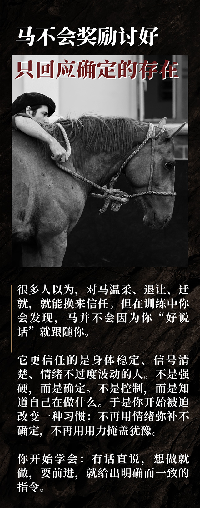 很多人说,是马术改变了自己。但真正骑得足够久之后,你会意识到一件事:马术并没有教你成为什么样的人,它只是一个不允许你继续假装的环境。在外人看来,这项运动也许关于技巧、力量、速度与勇气,关于控制一匹比自己强大得多的动物。 但只有身在其中你才会明白,马术真正要求的,从来不是“表现”,而是清晰、确定,以及责任。而正是因为这样,很多人第一次在马背上正视了自己。 马年被赋予了速度、力量与前行的象征。但对真正骑马的人来说,力量从来不是用力,而是清楚自己要什么,并敢于为此行动。马术真正改变的,或许只是这一点:它让你再也无法对自己含糊其辞。 |