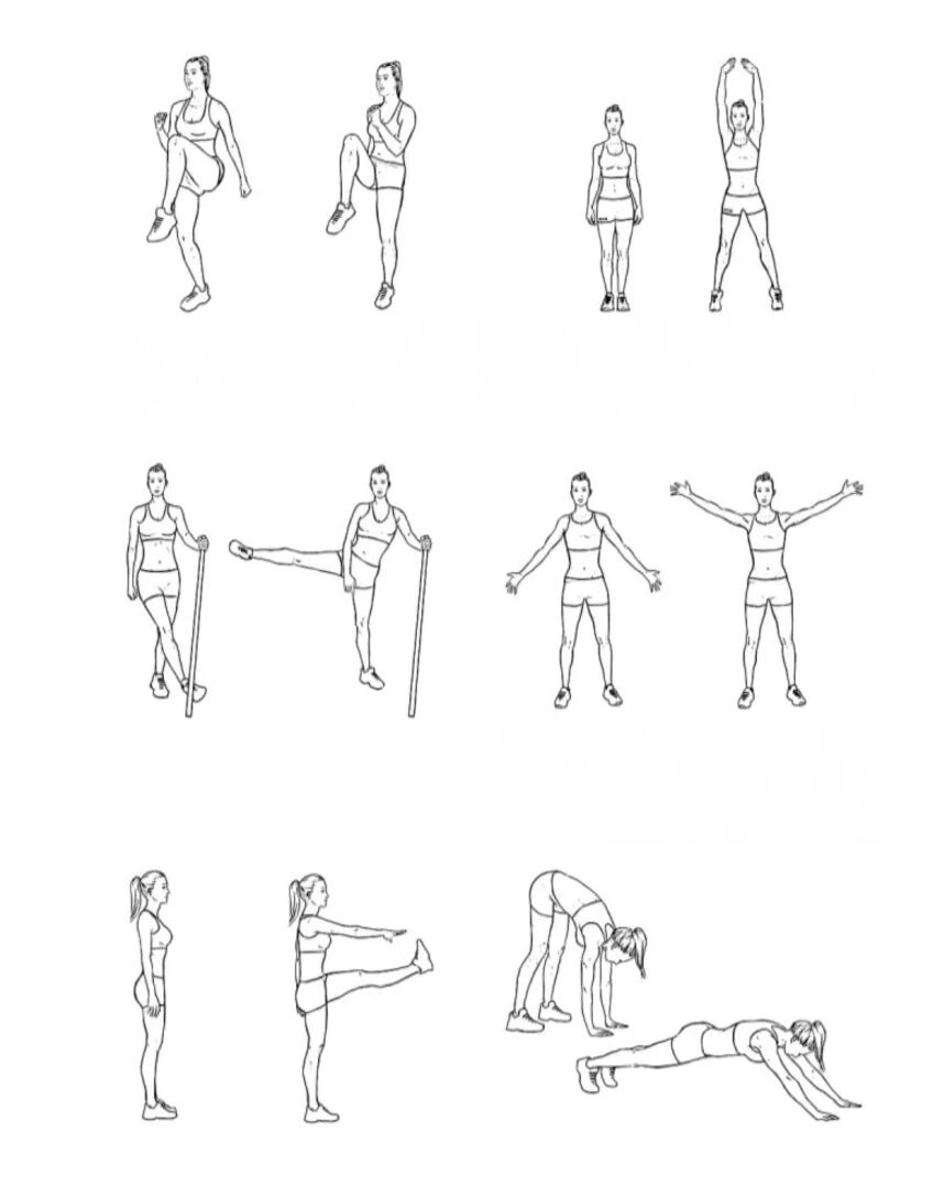 通过骨盆旋转、向前和侧向弓步以及脚踝旋转来完成。最后,可以进行一些快走或慢跑练习,从而温和地激活心血管系统。