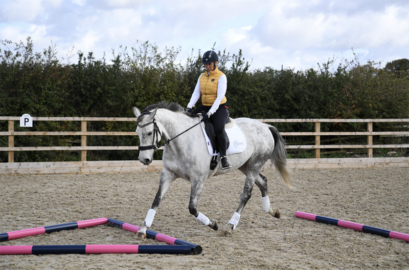 长期室内绕场会使马无聊,建议加入地杆、卡瓦莱提小障碍等组合练习;热身阶段的慢步过地杆即可有效放松背部、激活核心。如果地面允许,偶尔外出短途训练也能提升马的积极性。