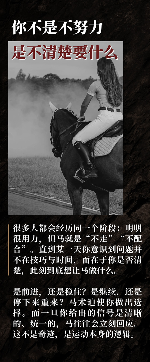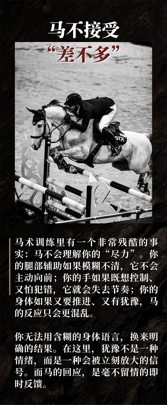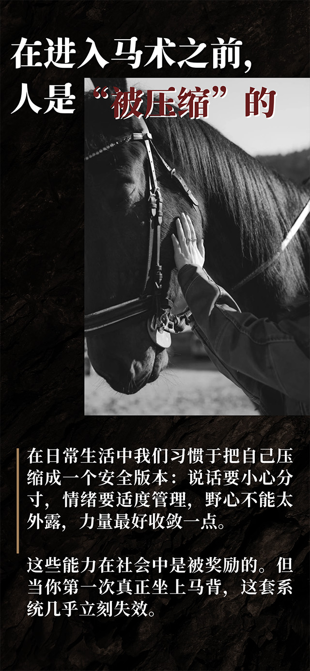 但只有身在其中你才会明白,马术真正要求的,从来不是“表现”,而是清晰、确定,以及责任。而正是因为这样,很多人第一次在马背上正视了自己。