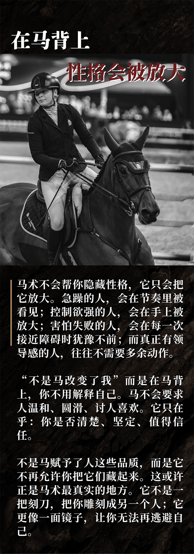 很多人说,是马术改变了自己。但真正骑得足够久之后,你会意识到一件事:马术并没有教你成为什么样的人,它只是一个不允许你继续假装的环境。在外人看来,这项运动也许关于技巧、力量、速度与勇气,关于控制一匹比自己强大得多的动物。